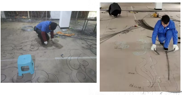看,來自東方彩燈的工匠們正在放樣、造型,按照效果圖,在地面上描一幅放大的勾線圖,然后將一根根鐵絲用鉗子扭成一段段彎曲的線條,把平面圖變成一幅由實(shí)體材料組成的框架。