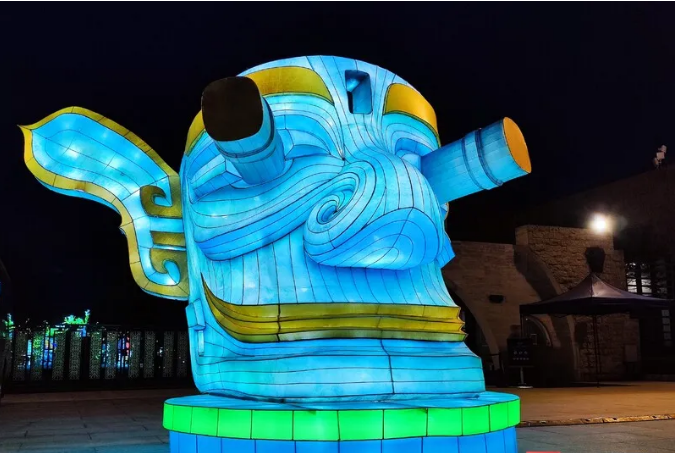 這次燈展由中青旅聯(lián)科策劃、自貢燈貿集團打造,設計靈感都來自于三星堆實體文物、考古發(fā)現(xiàn),包括包括青銅大立人、青銅縱目面具、青銅神樹、黃金面具、青銅神鳥等。