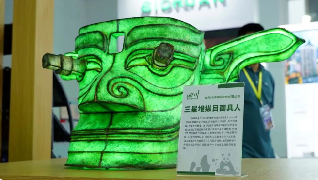 本屆青洽會中,四川館以“激情大運(yùn)·魅力四川”為主題,分設(shè)“激情大運(yùn)”“特色科技”“三星堆文創(chuàng)”“川貨出川”四大展區(qū)。自貢燈貿(mào)集團(tuán)股份有限公司的最新微縮彩燈工藝產(chǎn)品——“三星堆縱目面具人”亮相青洽會,攜手其他特色文創(chuàng)展品共同生動展現(xiàn)四川風(fēng)采。